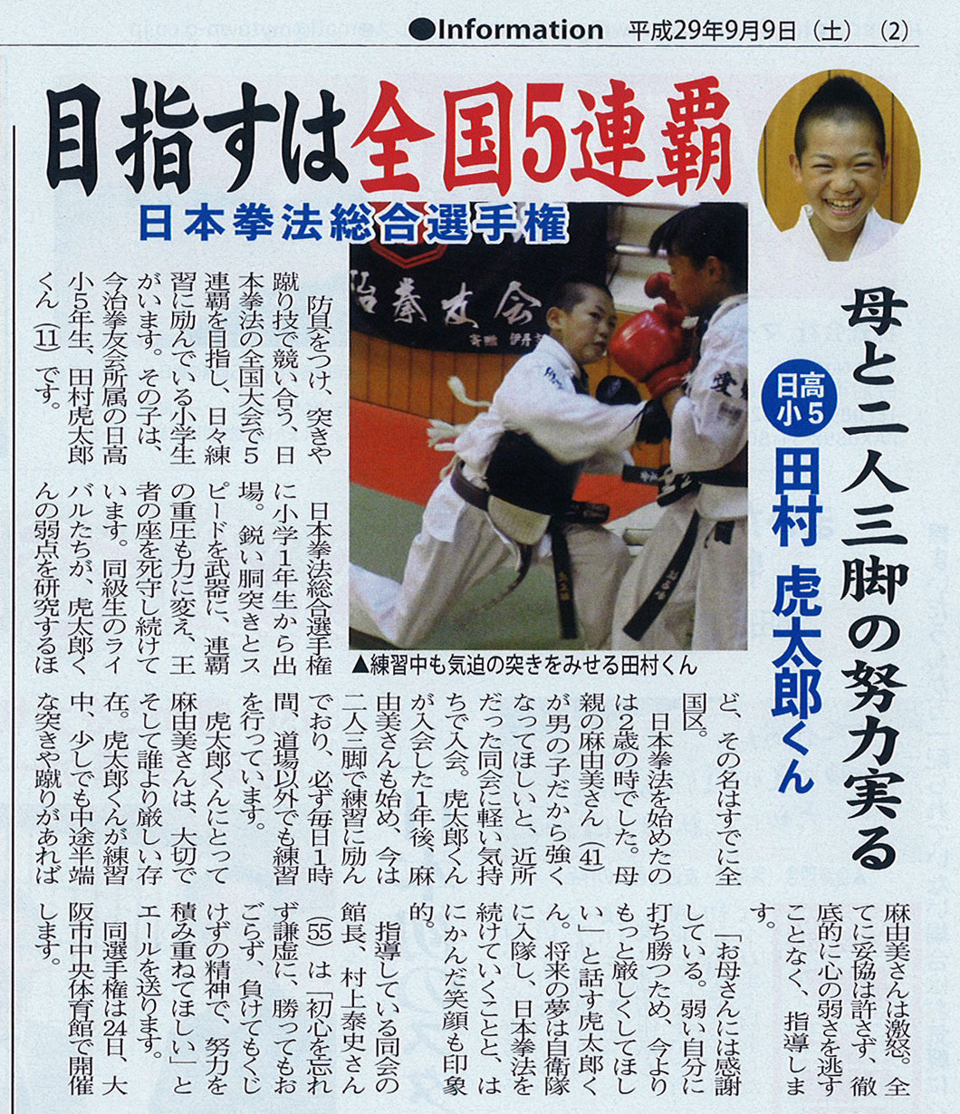 日本拳法総合選手権に小学1年生から出場。鋭い胴突きとスピードを武器に、連覇の重圧も力に変え、王者の座を死守しつづけています。同級生達のライバルたちが、虎太郎くんの弱点を研究するほど、その名は全国区。