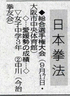 | (大会結果) 【小学低学年男子】三 位 福原 瑛太(今治拳友会) 【小学生低学年女子】三 位 船水 紗良(今治拳友会) 【小学4年生】敢闘賞 戴 福澤(今治拳友会) 【小学5年生】優 勝 水本 芽依(今治拳友会) 【小学6年生】優 勝 福原 宏典(今治拳友会) 三 位 重松 大志(今治拳友会) 敢闘賞 藤原 真音(今治拳友会) 【中学3年生男子】優 勝 檜垣湧之将(今治拳友会) 準優勝 阿部 讃大(今治拳友会) 【中学生女子】優 勝 中川はるか(今治拳友会) 【高校生男子】優 勝 田村虎太郎(今治拳友会) 敢闘賞 阿部 讃大(今治拳友会) 【高校一般女子】優 勝 中川はるか(今治拳友会) 【壮 年50】準優勝 渡邉 歩(今治拳友会) 三 位 矢野 寿樹(今治拳友会) 【一般男子 (有段)】敢闘賞 田村虎太郎(今治拳友会) |