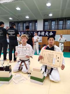 | 【中学3年男子】優 勝 齊藤 俊彰 準優勝 阿部 讃大 三 位 檜垣湧之将 【中学3年女子】優 勝 中川はるか 【小学6年男子】優 勝 福原 宏典 準優勝 藤原 真音 三 位 重松 大志 【小学5年女子】優 勝 水本 芽依 【小学2年男子】優 勝 福原 瑛太 【一般男子段外】優 勝 越智 淳斗 その他の成績 【高校一般女子】(練習試合)優 勝 中川はるか 各部門の入賞者(優勝)は、9月に大阪で行われる全国大会の出場権を獲得。 但し、幼年、一般段外を除く。 |